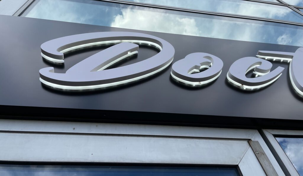 Une enseigne Dibond ajourée est une plaque en aluminium composite dans laquelle des formes, lettres ou logos sont découpés. L’effet visuel est obtenu par transparence, rétro-éclairage, ou le fond visible à travers les découpes.